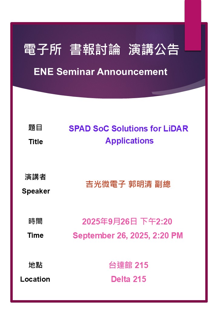114/09/26(五)演講公告: SPAD SoC Solutions for LiDAR Applications